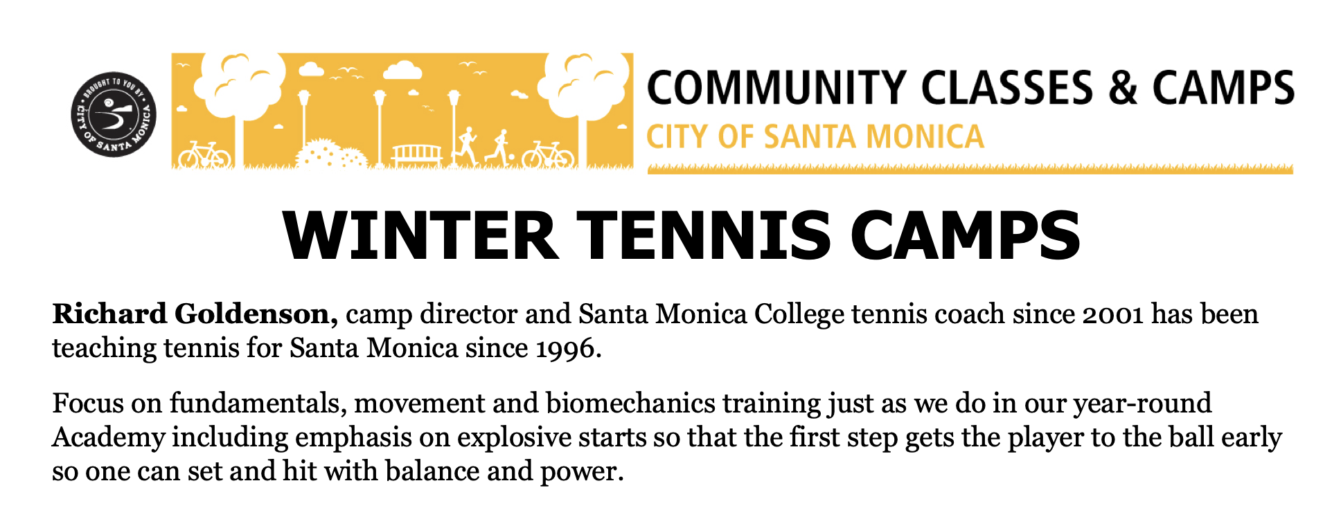 Questions, please call Richard Goldenson at 310.358.3393 or email him at Richard@SantaMonicaTennis.